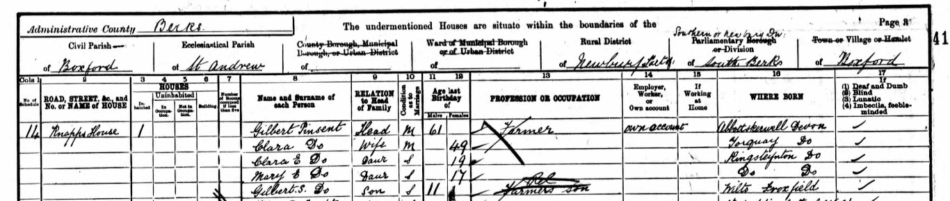 Gilbert Soudon was the only son of Gilbert Pinsent by his wife Clara (née Bridgman). The couple farmed at “Ware Barton” in Kingsteignton in the 1870s and had two daughters there. They then moved to “Scrope” Farm, near Hungerford in Berkshire, and it was there that their son Gilbert was born. Gilbert and Clara went to live in Newbury while he was still a young boy, so Gilbert Soudon was the first of his line to miss out on farm life. The census records show that the family lived at “Knapps House,” in Bloxford, in 1901. Boxford is four miles northwest of Newbury. It also tells us that Gilbert Soudon was “a farmer’s son,” which was true enough.