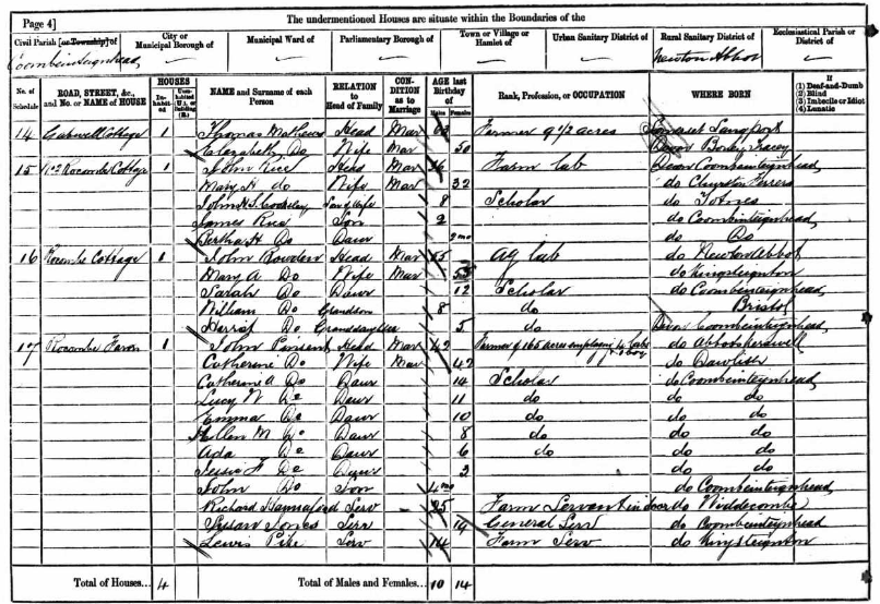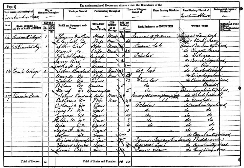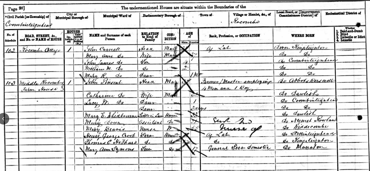 John and Catherine and their ever-growing family of young daughters (he had seven before the arrival of his first, and as it happens, only surviving, son, John Pinsent) were still living at “Middle Rocombe” when the Census was retaken in 1881. This one tells us that the farm covered 165 acres and that John was still employing four labourers and a boy, and he still had three household servants. His daughters were growing up; Catherine Pinsent, Lucy Pinsent, Emma Pinsent, Ellen Pinsent and Ada Pinsent were “scholars.” Their sister, Mary Eliza Pinsent was, for some reason, staying with Whidborne relations at Shute in Bishopsteignton. John’s two youngest children, Jessie Pinsent and John Pinsent were still young; she was two and John was just four months old.