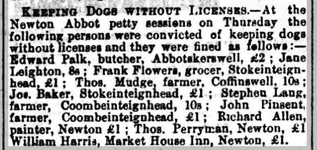 Two advertisements placed in the Western Times Friday 10th December 1875 issue are of note: One describes the loss of a white and liver coloured spaniel called “Sport:” – Mr. Pinsent of Rocombe was offering a reward. The other placed immediately below it, says: “Found, a spaniel dog”. … One hopes they were reunited. Interestingly, another liver and white spaniel turned up “Found” at the neighbouring farm of Lower Rocombe around Christmas 1880. However, this one may have come from Christow (Western Times: Friday 31st December 1880).“Sport” and his kennel mates led to their master receiving a dressing down at the “Newton Abbot Petty Sessions” in April 1884. John Pinsent was fined £1 for keeping dogs without a license (East and South Devon Advertiser: Saturday 12th April 1884)!