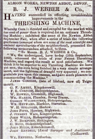 Mr. John Pinsent of Ware (and, one would imagine, some of this brothers) witnessed a “B. J. Webber & Co.” threshing machine in action in October 1863 and he, along with other local farmers signed a promotional letter extolling its virtues (Exeter and Plymouth Gazette: Friday 2nd October 1863).