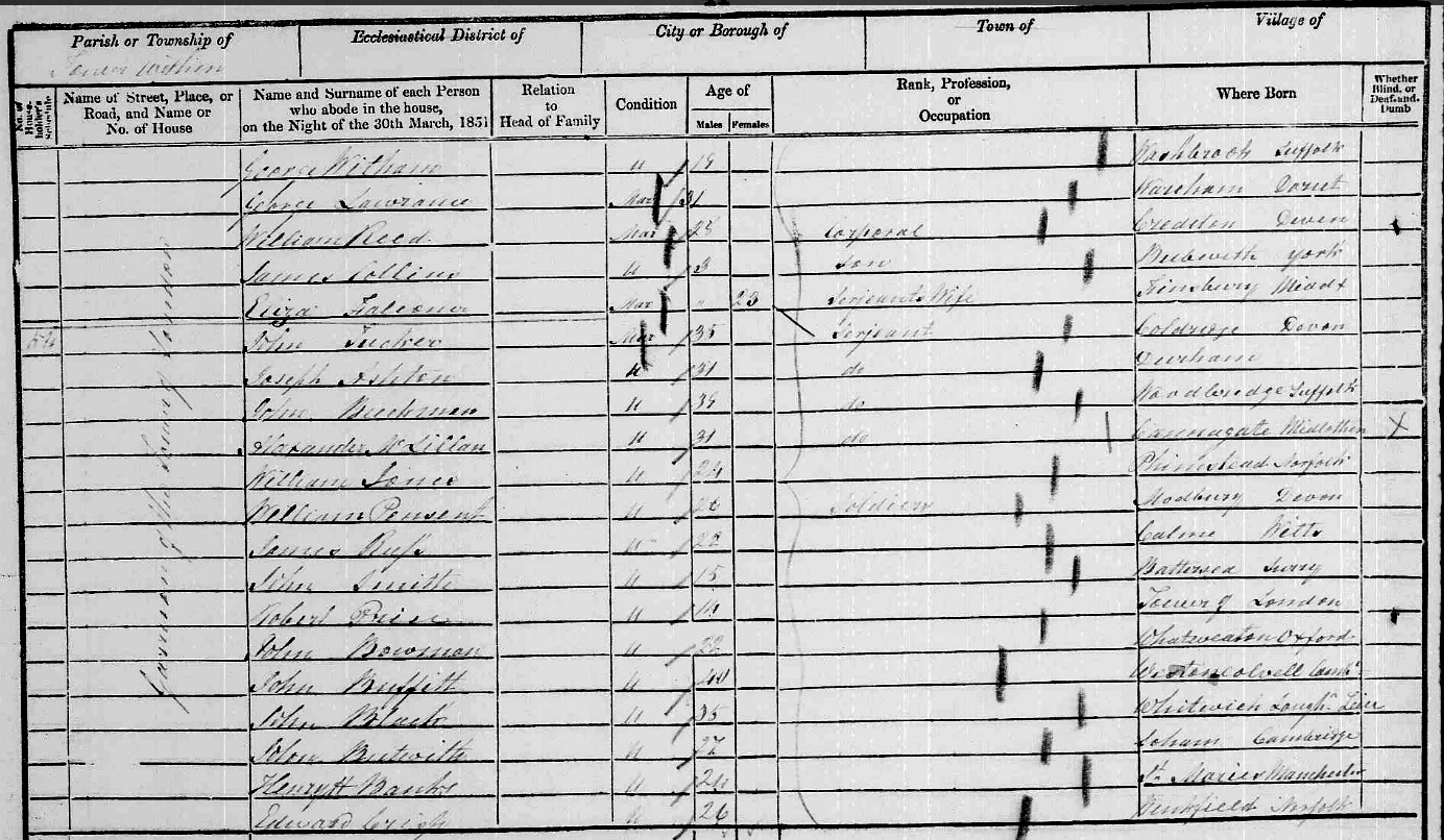 William and Jane (née Crockwell) had four sons and four daughters; however, there is not a lot known about any of them. Their eldest son, another William Pinsent, appears to have been a soldier in the Tower of London Garrison at the time of the 1851 Census. He was a “Sergeant” in the Coldstream Guards. He never married and, sadly, died of tuberculosis in London, in 1854. I have no information on their second son, John Pinsent. He may have died young or emigrated. Their third, Thomas Pinsent, was almost certainly the eighteen-years old young man who died at #2 Martin Lane in Plymouth in February 1851. His mother and his brother were living on the same street when the Census takers made their rounds a few months later.