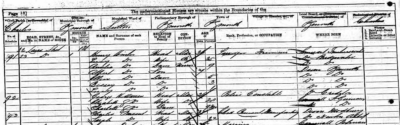 William claimed to be a “merchant” when his son Charles married for a second time, in 1868, and was a “poulterer” staying with a lodging-house keeper in St. Columb Major in Cornwall at the time of the 1871 Census. Perhaps he was still acting as a “travelling salesman” of some sort. William was in lodgings in Newton Abbot when the Census takers returned in 1881 and he died in the Union Workhouse there, aged 85, the following year. Sadly, he does not seem to have had been as successful as his father (Gilbert Pinsent) or, for that matter, his brother (John Pinsent). Their lives are described elsewhere.