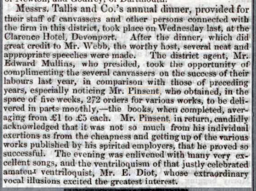 The 1851 Census, meanwhile, tells us that he was as a “commercial traveller” and a “book-seller” staying at the Carlyon Arms Inn, in St. Neots, Cornwall. He must have been good at it as his employers, “Tallis and Co.”, singled him out at its staff dinner in 1852: “Mr. Pinsent, (who) obtained, in the space of five weeks, 272 orders for various works, to be delivered in part monthly, – the books, when completed, averaged from £1 to £5 each. Mr. Pinsent, in return, candidly acknowledged that it was not so much from his individual exertions as from the cheapness and getting up of the various works published by his spirited employers, that he proved so successful” (Western Times: Saturday 24th January 1852).