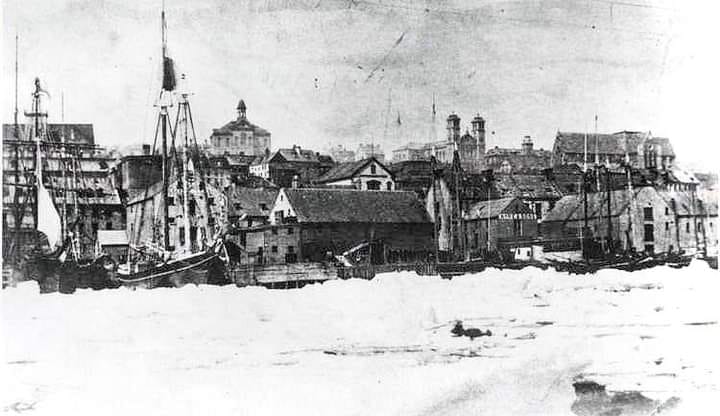A faded black and white photograph of the wharves at St. John's, Newfoundland, seemingly locked in with ice and snow.