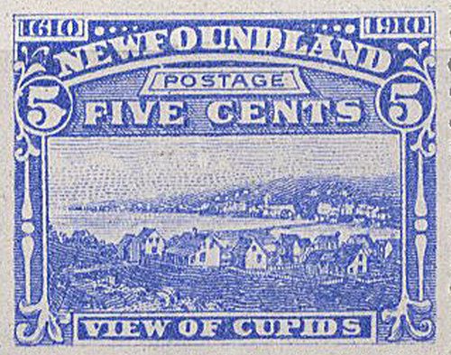 A Newfoundland five cent stamp showing a view of Cupids, 1910.