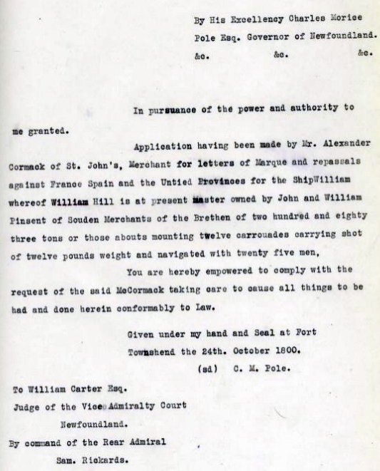 A typed document reading as follows: "By his Excellency Charles Meriee, Pole Esq. Governor of Newfoundland. In pursuance of the power and authority to me granted. Application having een made by Mr. Alexander Cormack of st. John's, Merchant for letters of Marque and repassals against France, Spain and teh United Provinces for the Ship William whereof William Hill is at present master owned by John and William Pinsent of Souden Merchants of the Brethren of two hundred and eighty three tons or those abouts mounting twelve carrouades carrying shot of twelve pounds weight and navigated with twenty five men, you are hereby empowered to comply with the request of the said McCormack taking care to cause all things to be had and done herein comfortably to Law. Given under my hand and seal at Fort Townshead the 24th October 1800. C. M. Pole. To William Carter Esq. Judge of the Vice Admiralty Court Newfoundland. By command of the Rear Admiral Sam Rickards.