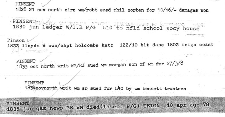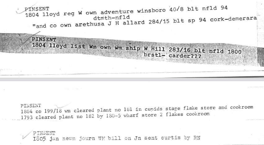 In the 1970s and 1980s, Dr. Keith Matthews studied the rise and fall of the Newfoundland fishery and built up a large, paper-based, “Name File” that is now in the “Maritime History Archive” at Memorial University, in St. John’s. It contains numerous references to William (and his brother John and, later, his nephew Robert John Pinsent). The references are in snippet form and come from the “Conception Bay Plantations Books,” “Lloyd’s Owners Registers” and other sources. There are abbreviations galore but they are, for the most part, intelligible. Together, they track William’s life both as a merchant and a ship-owner. However, it is worth noting that they contain occasional references to other Williams  and Johns – so each entry needs to be taken in context.