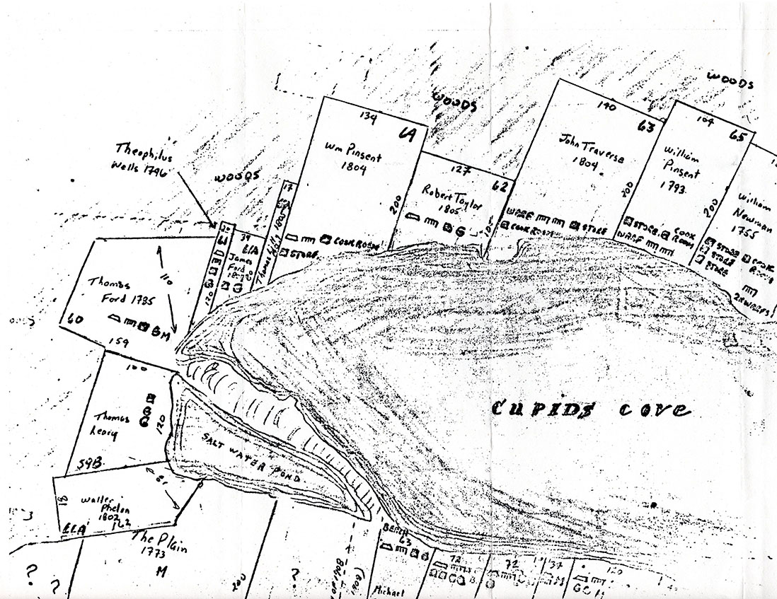 A hand-drawn map illustrating a series of properties around Cupid's Cove.