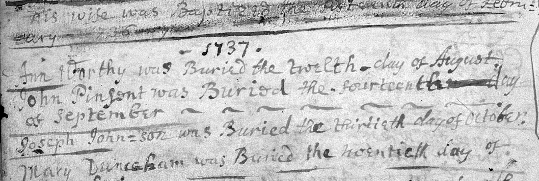 John Pinsent “senior” died in 1737 leaving his widow with several relatively young children to look after. He left a Will (“Calendar of Devonshire Wills and Administrations”); however, it was destroyed when the Exeter “Probate Registry” was bombed during the Second World War: its contents are unknown.