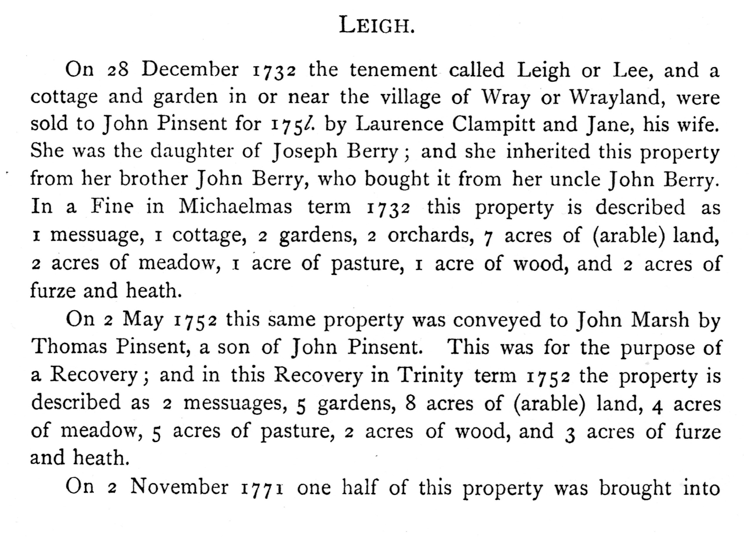 John purchased a tenement called “Leigh”, from Laurance Clampitt and his wife on 28th December 1732. It was near Wreyland Cross, just to the east of the village of Lustleigh. “Leigh” was contiguous with and down slope from, “Kelly.” At the time, it was described as “1 messuage, 1 cottage, 2 gardens, 2 orchards, 7 acres (arable) land, 2 acres meadow, 1 acre pasture, 1 acre wood, and 2 acres of furze and wood”. He later passed it to his younger son, Thomas, and the latter conveyed it to John Marsh on 2nd May 1752 (Cecil Torr: Wreyland Documents). This is not the first time that the Pinsent family owned land at “Kelly” and “Leigh”. According to Cecil Torr, Court Roll documents show that a Roger Pynsant held “one messuage and half a furlong of land in Calwelegh” (“Kelly with Leigh”) in 1437. Whether this Roger’s line made it through to the eighteenth century is not known.